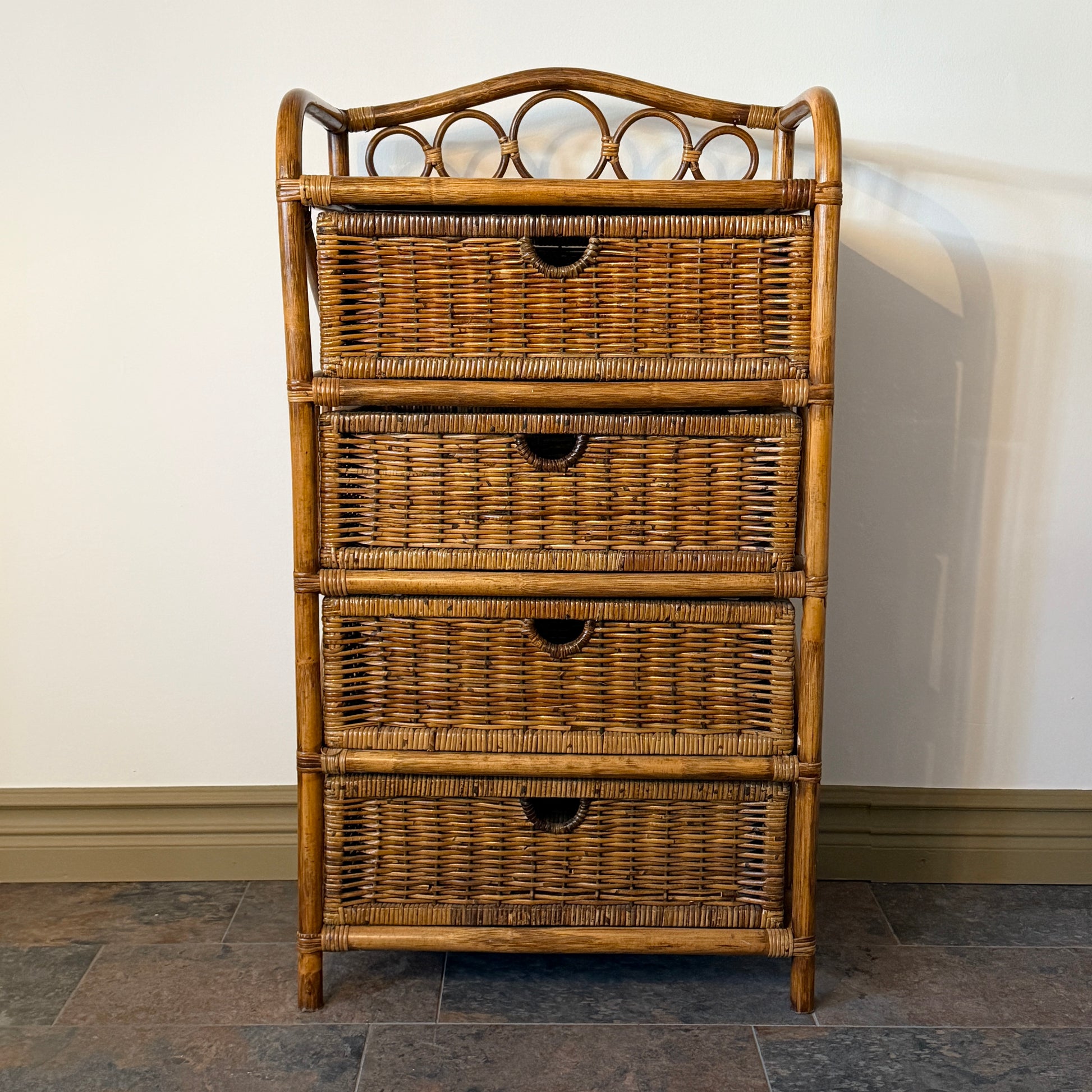 Vacker rottingbyrå som kombinerar funktion och naturlig elegans. Möbeln är tillverkad i robust rotting med varm honungsbrun ton och har fyra rymliga lådor som ger gott om plats för förvaring.