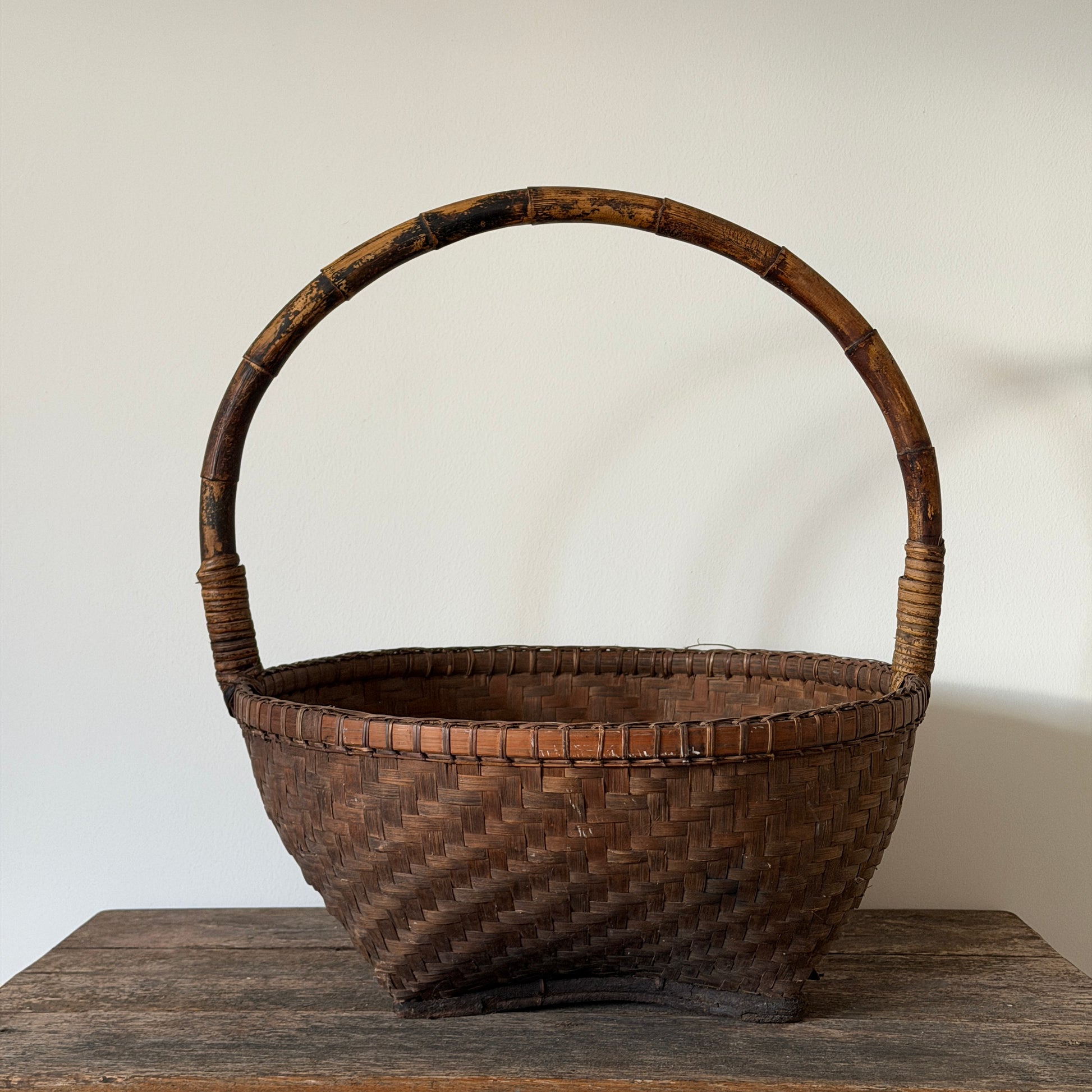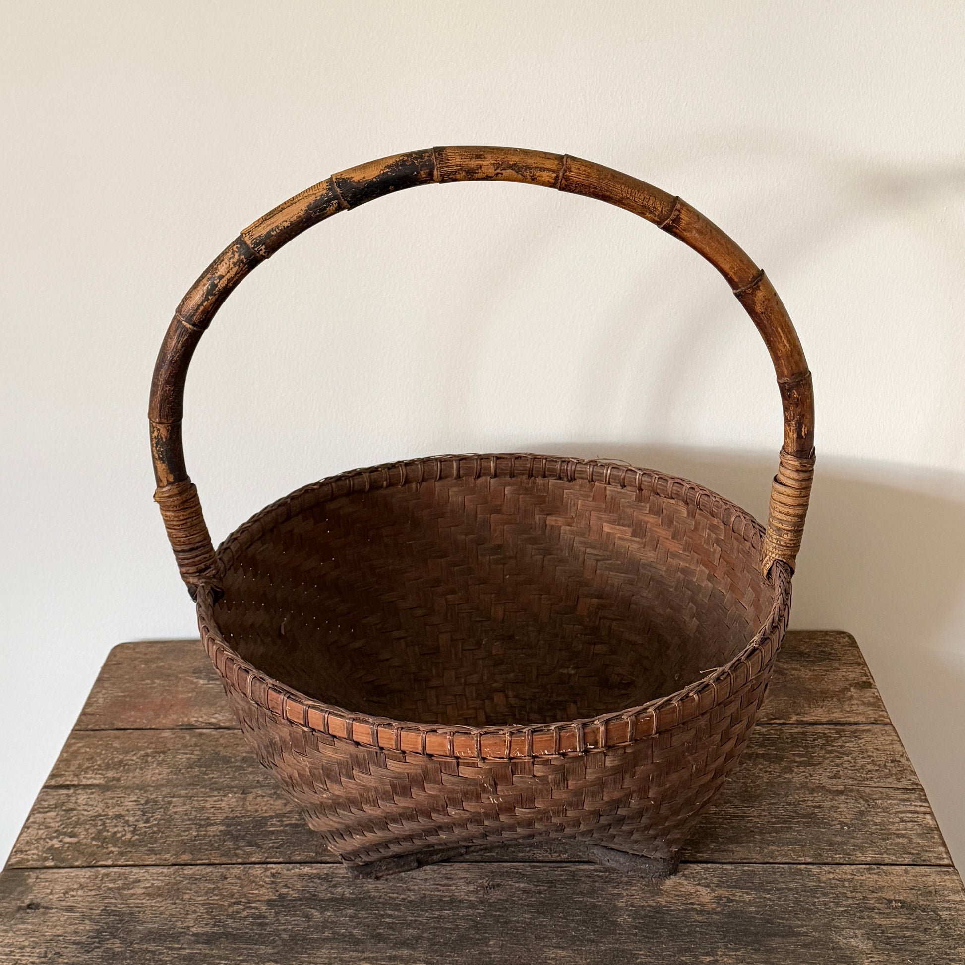 Handflätad vintagekorg med böjd hank