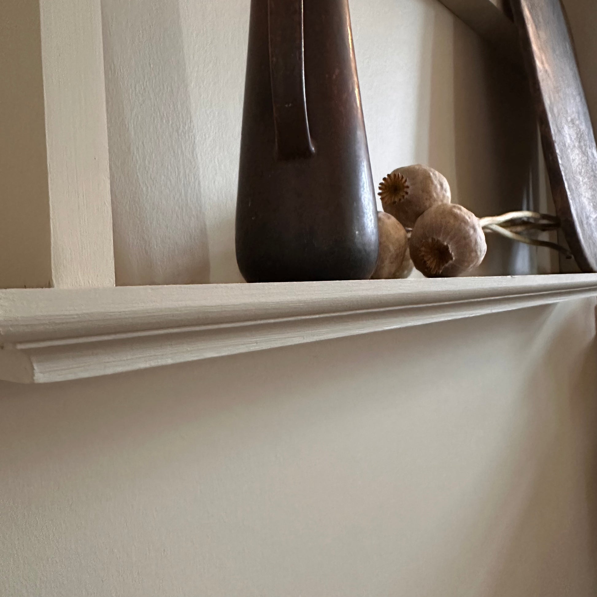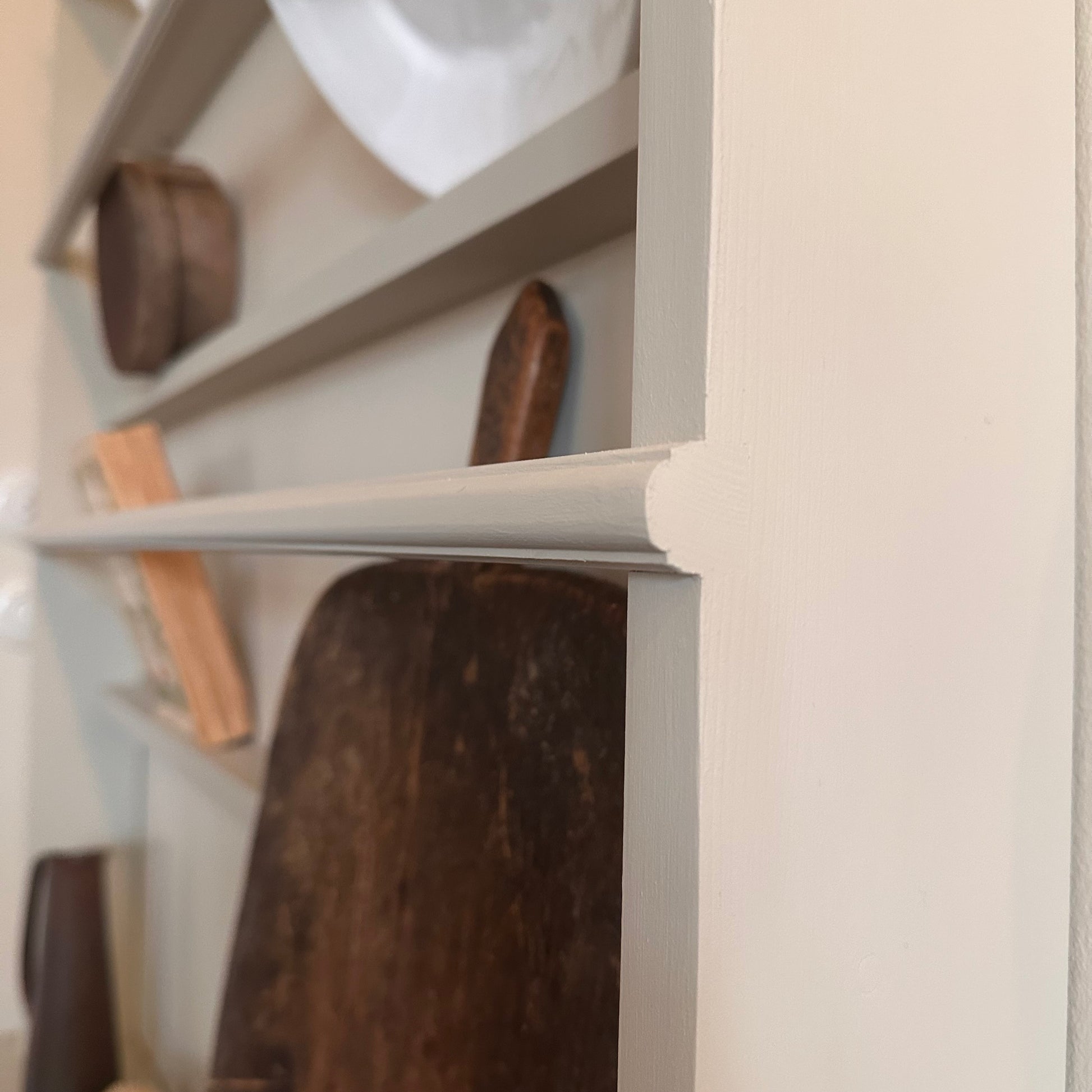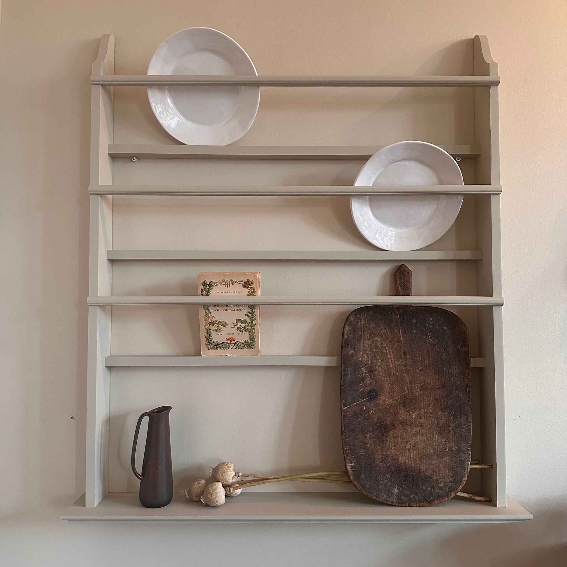 Denna eleganta tallrikshylla är ett tidlöst inslag i kök, matsal eller vardagsrum. Den är nu målad i den mjukt traditionella kulören Old White från Farrow & Ball – en varm, lugn nyans som ger ett harmoniskt och klassiskt uttryck. Den matta ytan framhäver hyllans form och gör att färgen upplevs mjuk och naturlig i alla ljus. Tillverkas på beställning i vårt eget källarsnickeri.