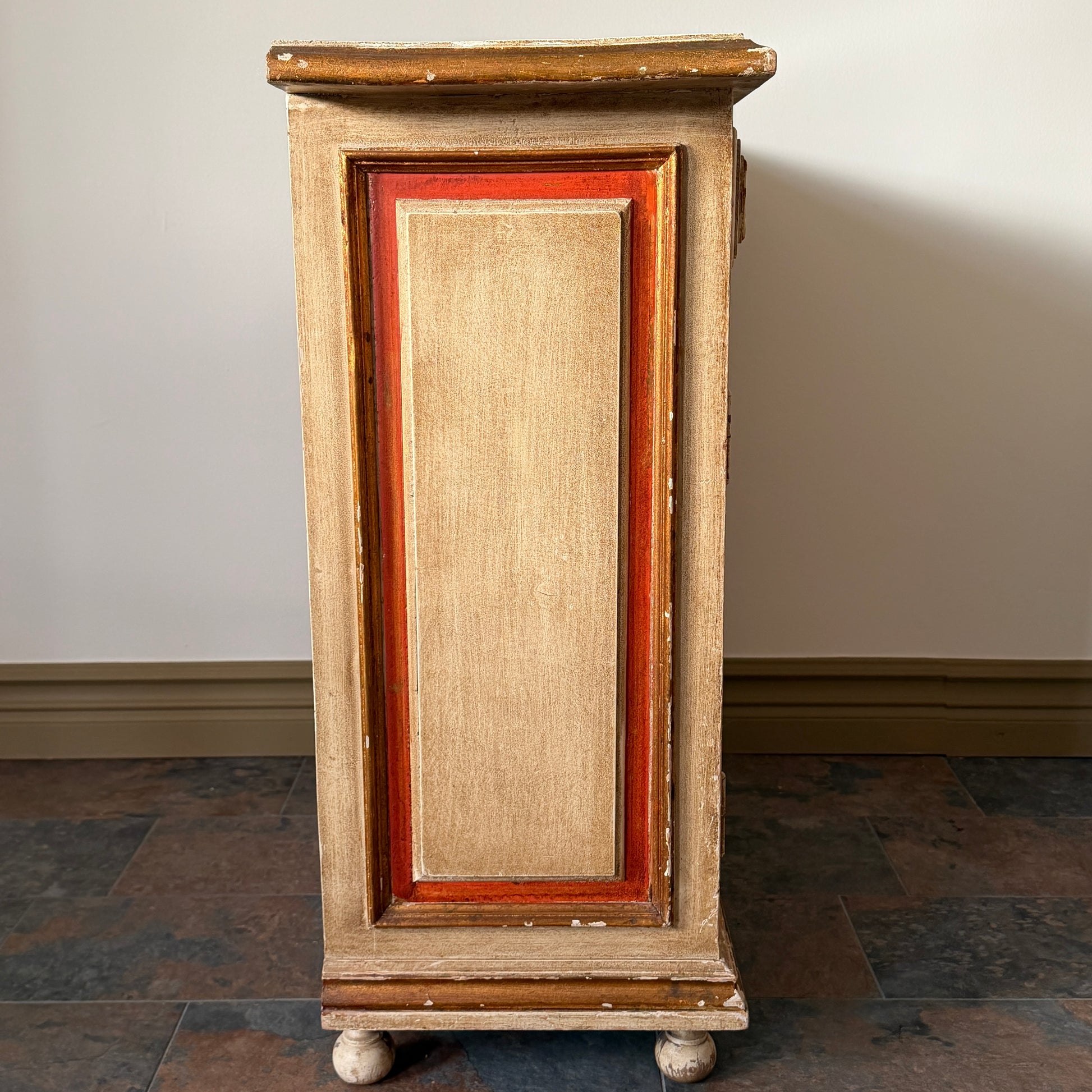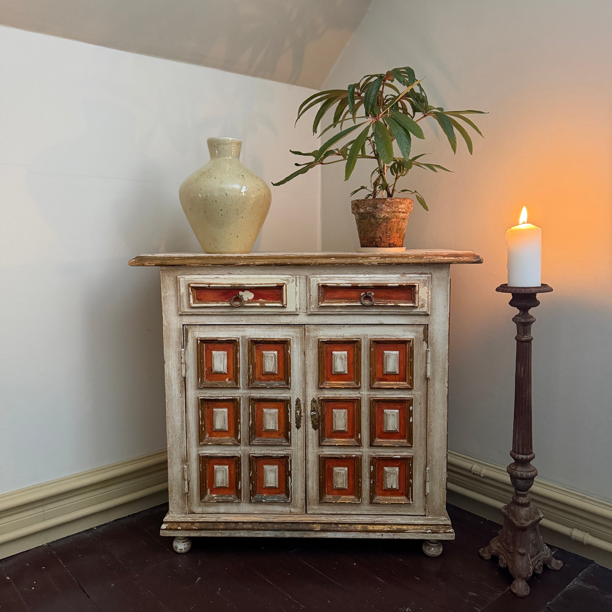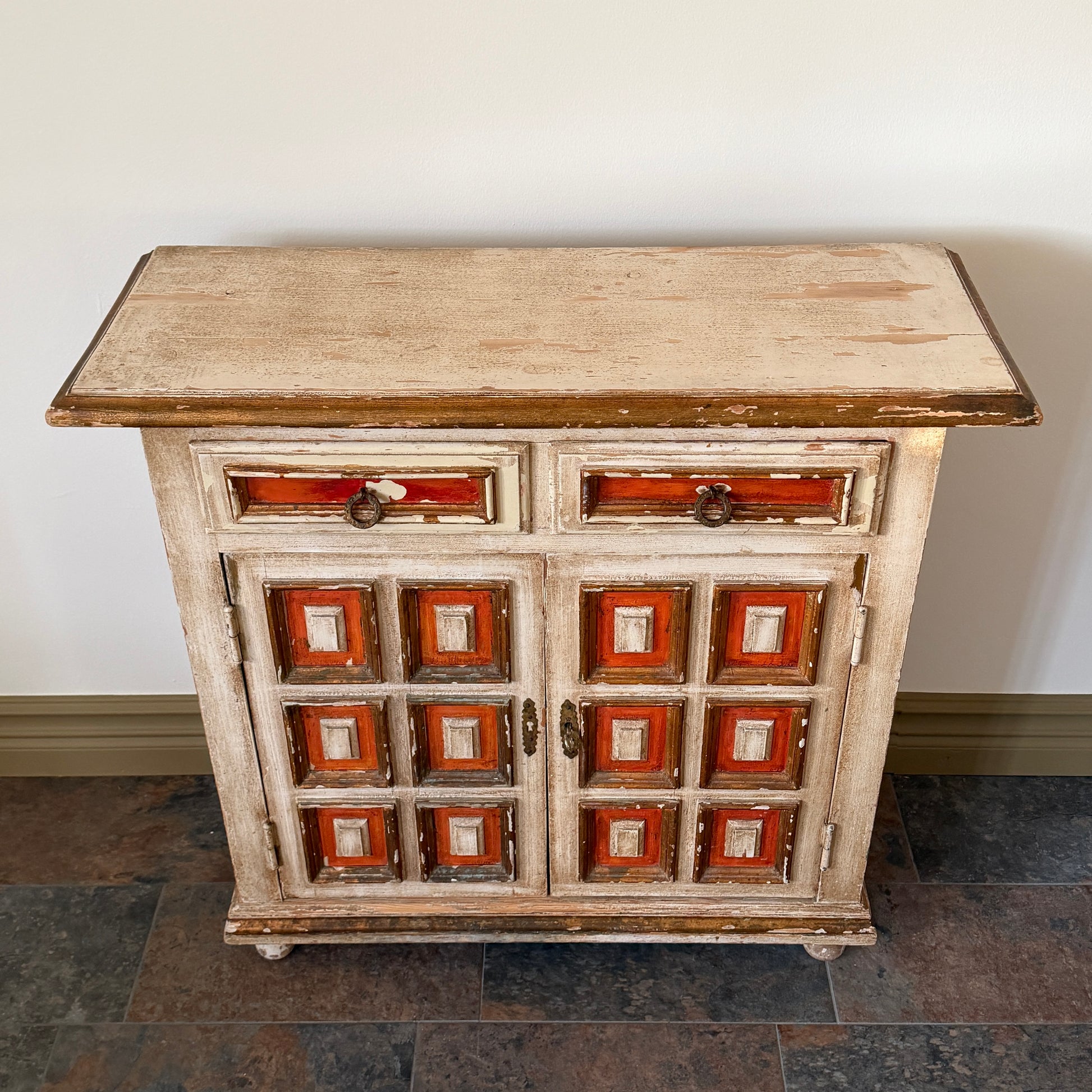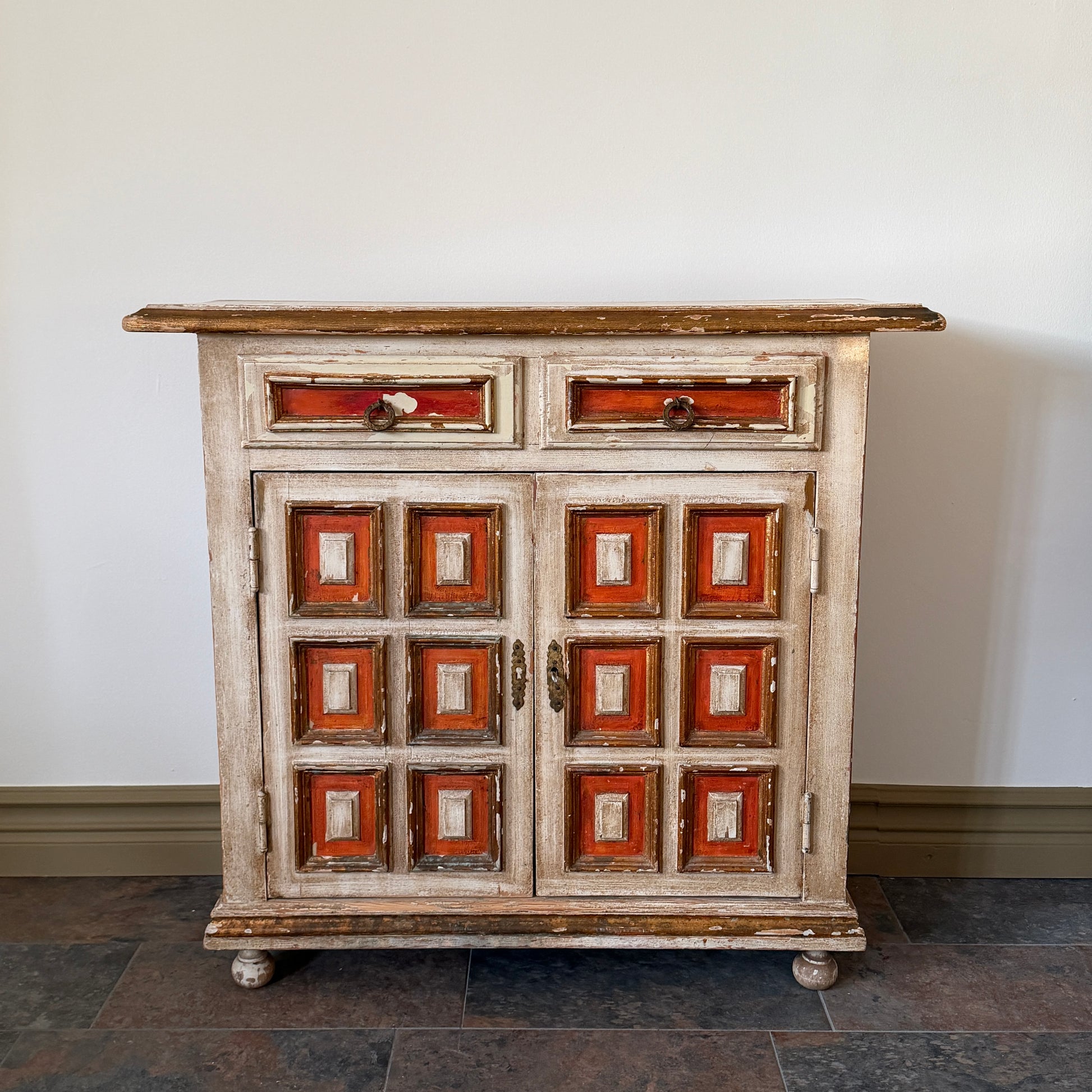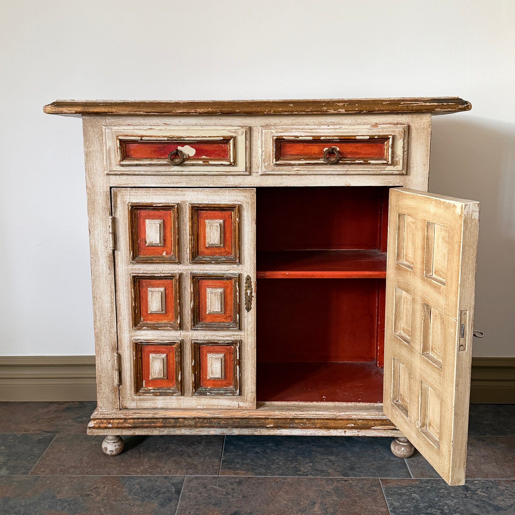 Ett fantastiskt franskt antikt skåp från mitten av 1800-talet som omedelbart blir ett blickfång i rummet. Skåpet har unik paneldesign med handmålade rutor i varma röda och krämiga toner, vilket ger möbeln en distinkt karaktär och ett genuint vintageuttryck. Den vackra slitna patinan visar upp skåpets historia och gör varje detalj helt unik.
