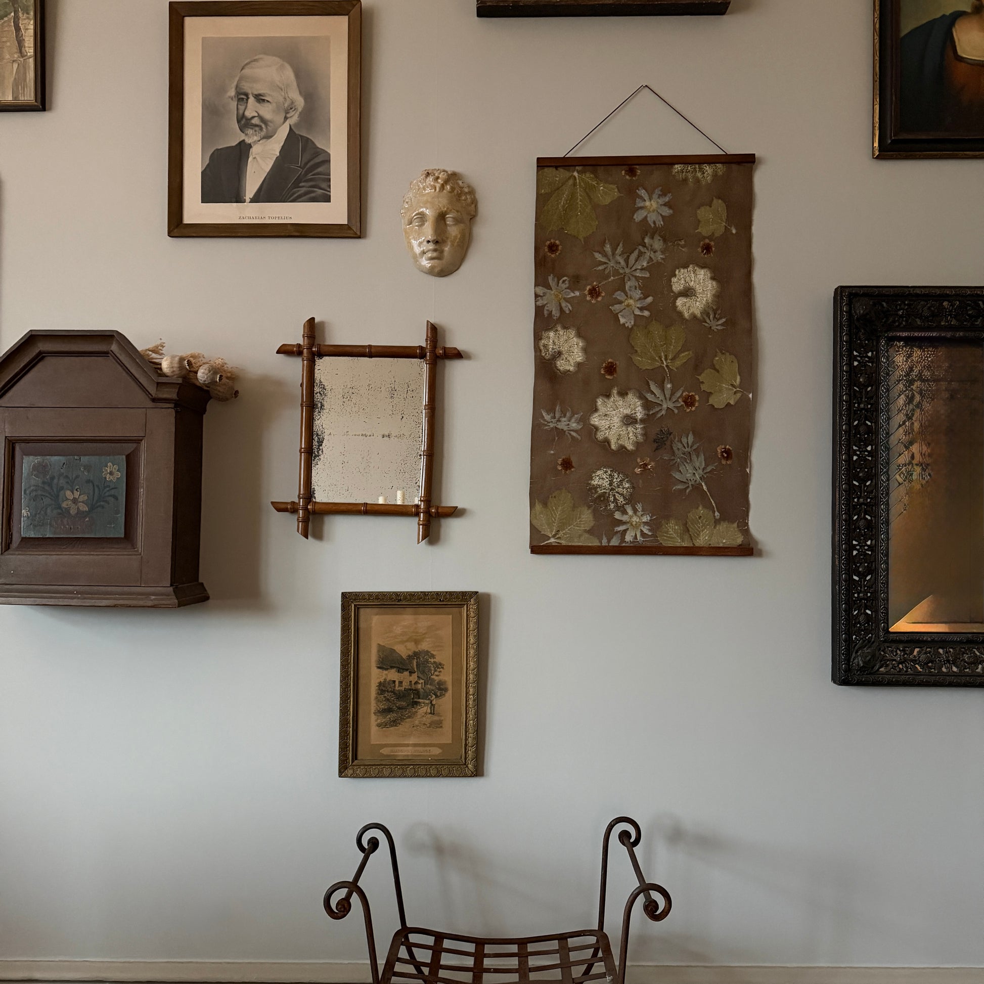 Denna tavla tar textil form med hytt är ck genom metoden ecoprinting från lokala blommor och växter. Otroligt vackert att bryta upp de vanliga tavlorna med textila former.